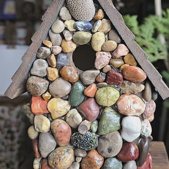 Rustic birdhouse crafted from genuine Lake Michigan beach stones by Scot and Jen. Works great indoors or outdoors, bringing natural coastal character to any space. Each handmade piece is unique, showcasing the beauty of weathered stone with authentic Great Lakes charm.