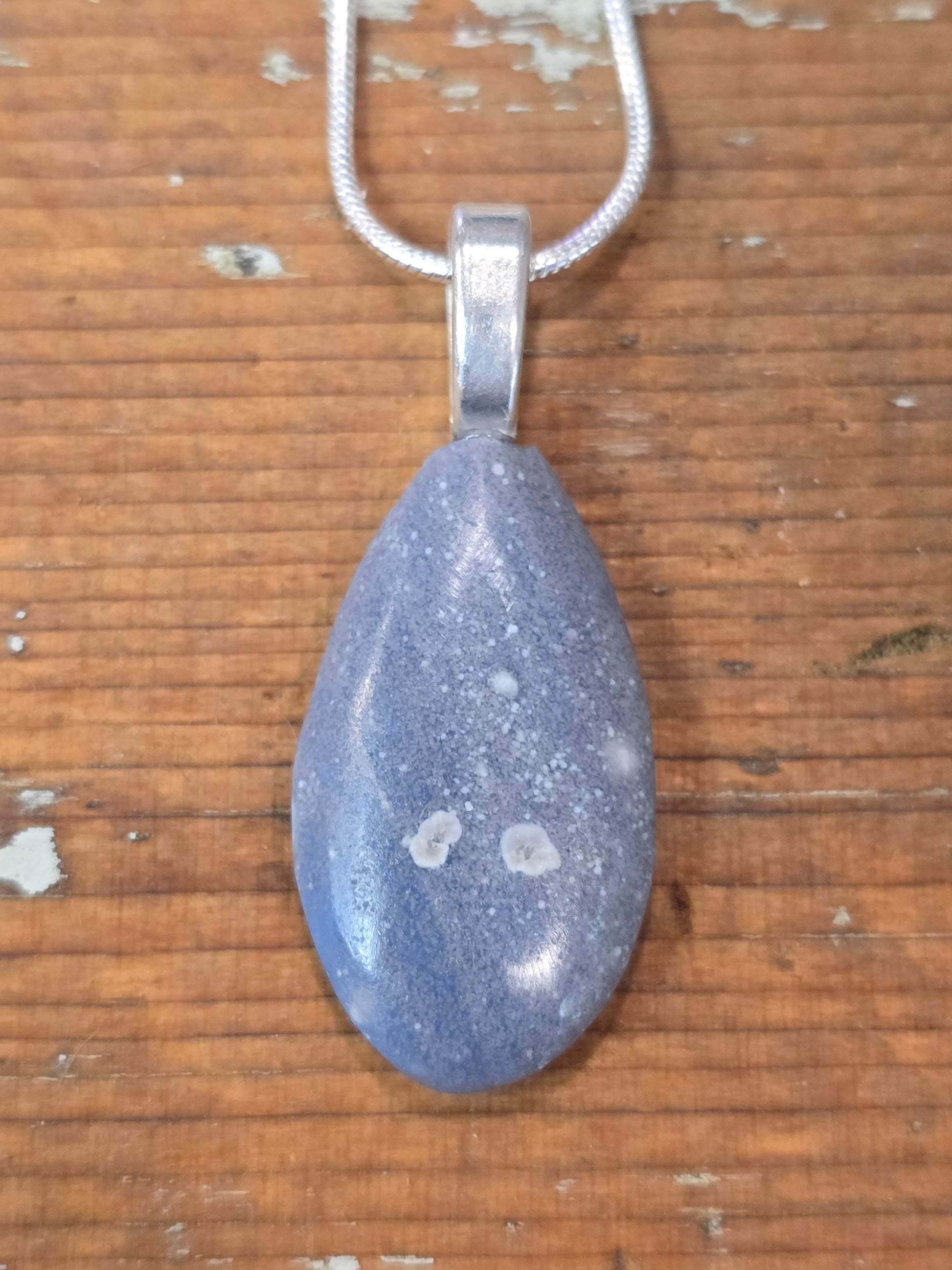 Discover the rare beauty of authentic Leland Blue in this stunning handcrafted pendant. This soft blue slag glass treasure was found and personally crafted by Scot and Jen, bringing together natural history and artisan skill. Each piece captures the distinctive character of genuine Leland Blue—a geological gem formed from industrial byproducts over a century ago. Perfect for collectors and those who appreciate one-of-a-kind wearable art, this pendant tells a story of discovery and dedication. Own a piece of Michigan's unique heritage with this exceptional creation.